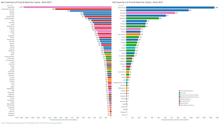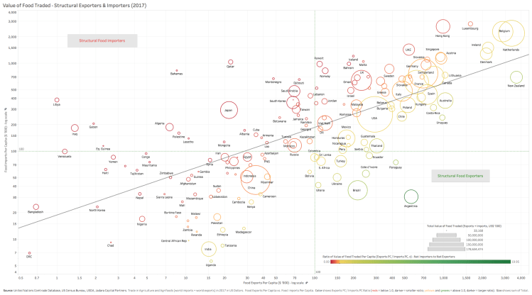 Looking at the sources and consumers of food by country from ’40k feet’, it is clear where the scalable and sustainable food supply will come from and where it is needed most. The first chart below segments countries by the ratio of the value of food & meat exports per capita relative to imports per capita (data from UNCTAD; size of each country bubble is the total size of the value of food trade (in US$s), the heat map corresponds to the intensity of the ratio of exports/imports – red=low exports/imports, green=high exports/imports). The second chart below takes the two extremeContinue reading “Who will feed the world in the next decades? Part I” - Who will feed the world in the next decades? Part II