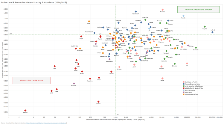 The ‘haves’ and the ‘have nots’ of #foodsecurity can also be classified by abundance (or scarcity) of the two essential inputs to farming and crop cultivation – arable land and renewable water resources. You either have them or you don’t . If we look at these vital resources in terms of per capita endowments, then the classification becomes abundantly clear. Here again, MENA countries (red) cluster almost exclusively in the ‘short’ quadrant (with the lone exception of Iran), while the ‘abundance’ quadrant is populated by the same large structural food exporters we highlighted in Part I (see: https://lnkd.in/dAwfXet). While land productivity is somethingContinue reading “Who will feed the world in the next decades? Part II” - Who will feed the world in the next decades? Part III